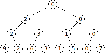 因此,举个例子,数组 [9,2,6,3,1,5,0,7] 的根节点包含数字 0 —— 整个数组的最小值。它的左子节点包含 [9,2,6,3] 中的最小,2;右子节点包含 [1,5,0,7] 中的最小,0。每个元素对应于一个叶节点,仅仅包含它自己。